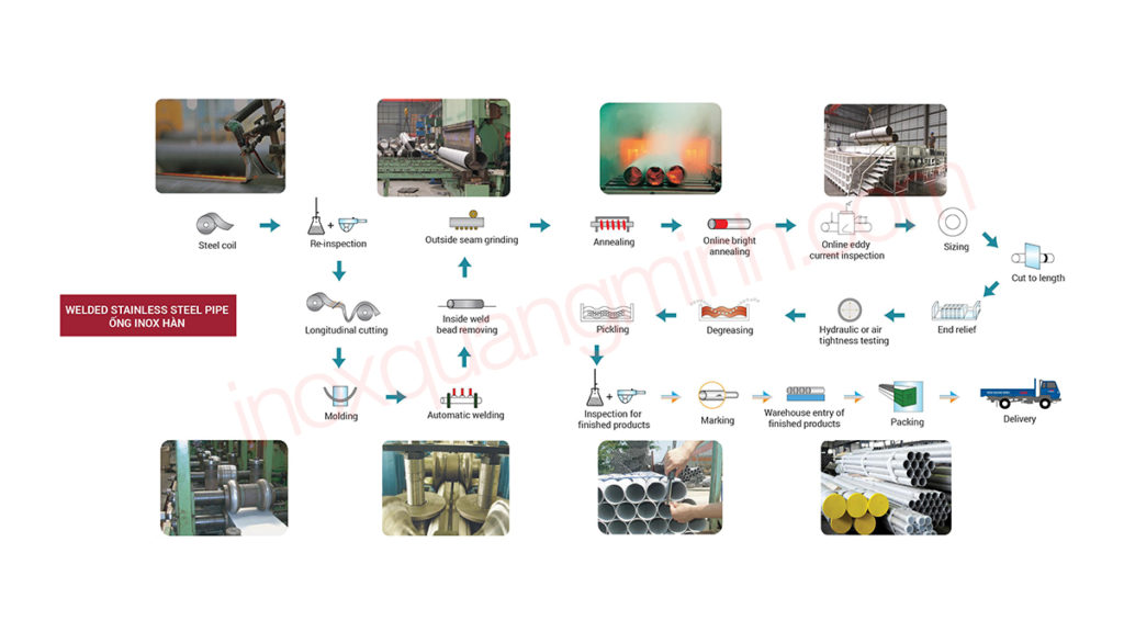 Khác với ống đúc được chế tạo từ phôi trụ đặc, ống hàn được chế tạo từ các tấm inox.